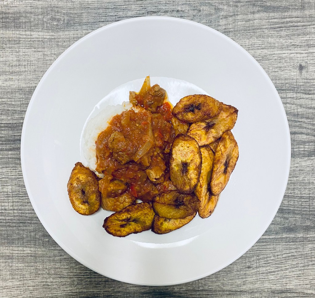 Put your tomato paste, habanero pepper, garlic cloves, black pepper, tomatoes, diced 1/2 medium sized onion, sliced red bell peppers, and a teaspoon of adobo seasoning or salt into a food processor or blender with 1/2 cup of water and blend until well mixed. Pour your vegetable oil into a pot and the other half of the diced onion and sauté for a bit. Put in a cube of beef bouillon, curry powder, paprika, rosemary and pork sirloin. Add a little bit of black pepper and salt and sauté the sirloin until it’s brown then pour in the blended mixture and a bay leaf. Let simmer for 20-25minutes and pair with some rice and fried plantains. Enjoy!